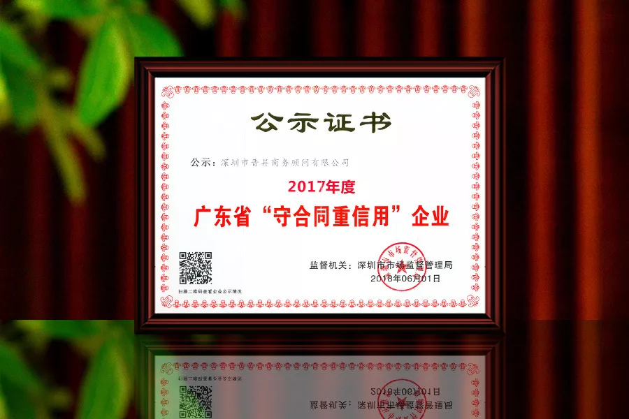 繽紛夏日,總有不斷的驚喜到來。近期,深圳市市場監(jiān)督管理局對2017年度廣東省“守合同重信用”企業(yè)進(jìn)行公示,晉昇國際榮獲2017年度廣東省“守合同重信用”企業(yè),并獲頒榮譽(yù)牌匾和榮譽(yù)證書。這是令人欣喜和鼓舞人心的時(shí)刻,晉昇國際團(tuán)隊(duì)將繼續(xù)砥礪前行,為廣大客戶創(chuàng)造價(jià)值!