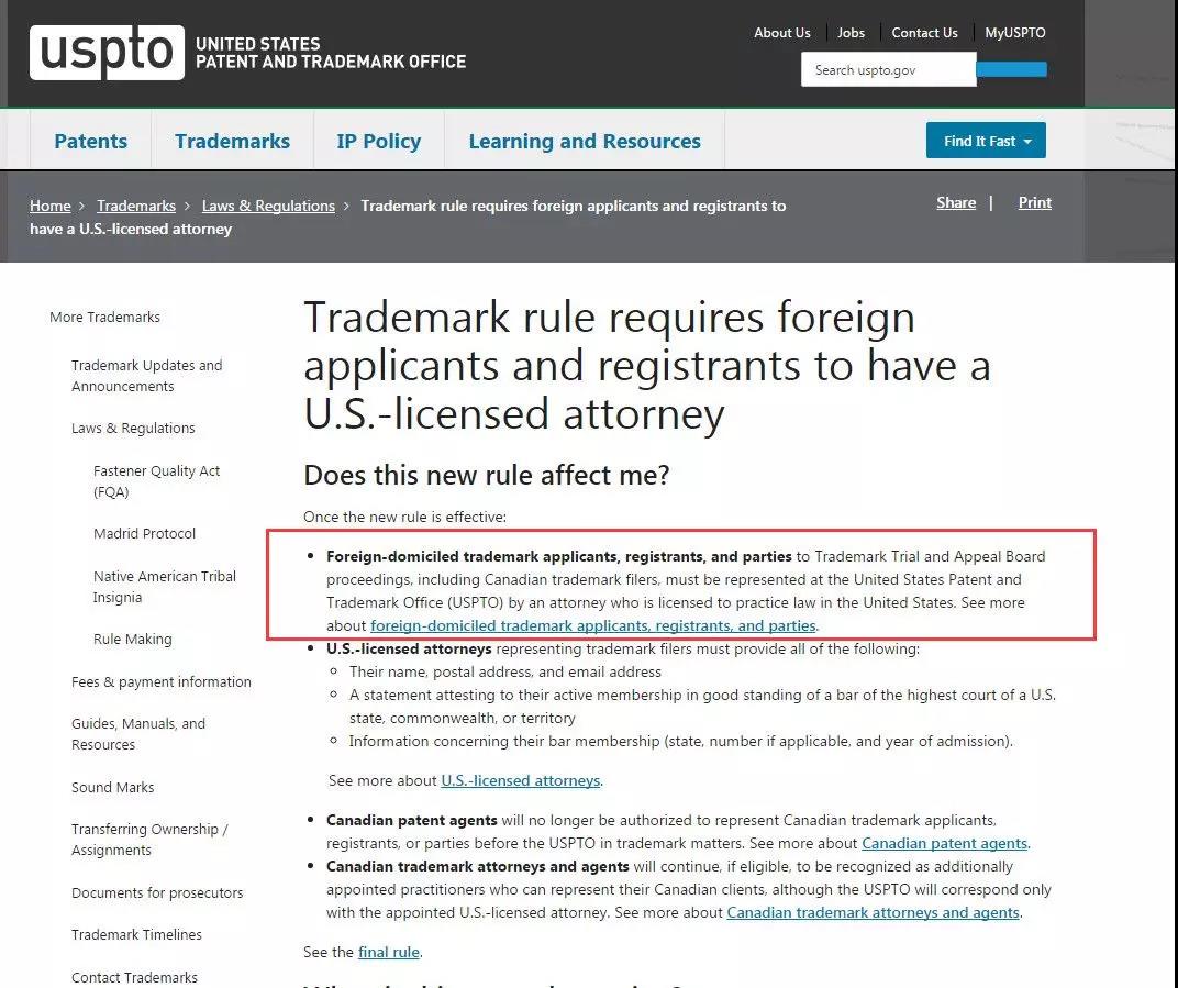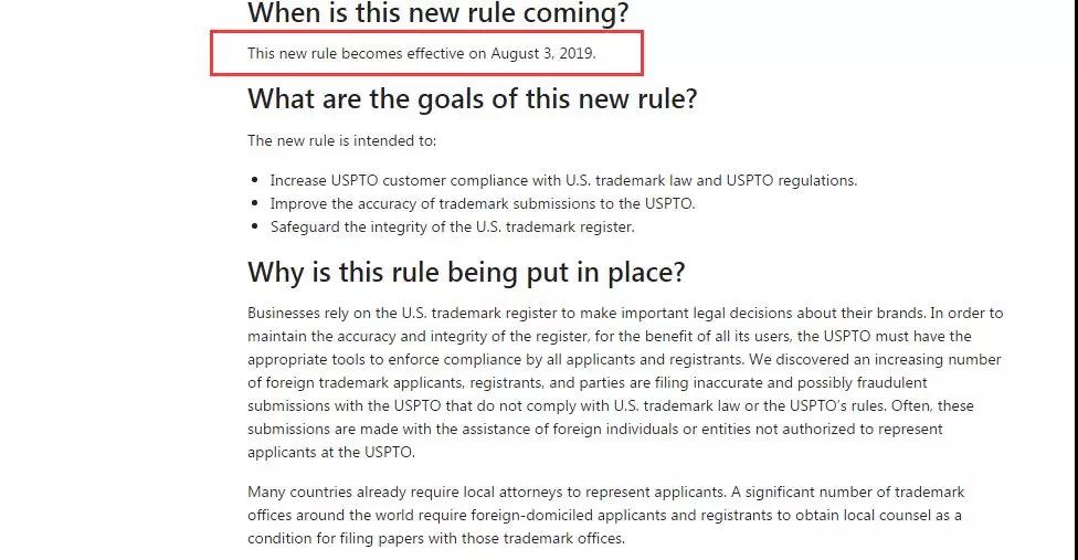 7月2日,美國專利商標局(USPTO)官宣:新的商標規則,要求外國商標申請人必須由在美國執業的律師代理,新商標規則的生效日期為2019年8月3日。