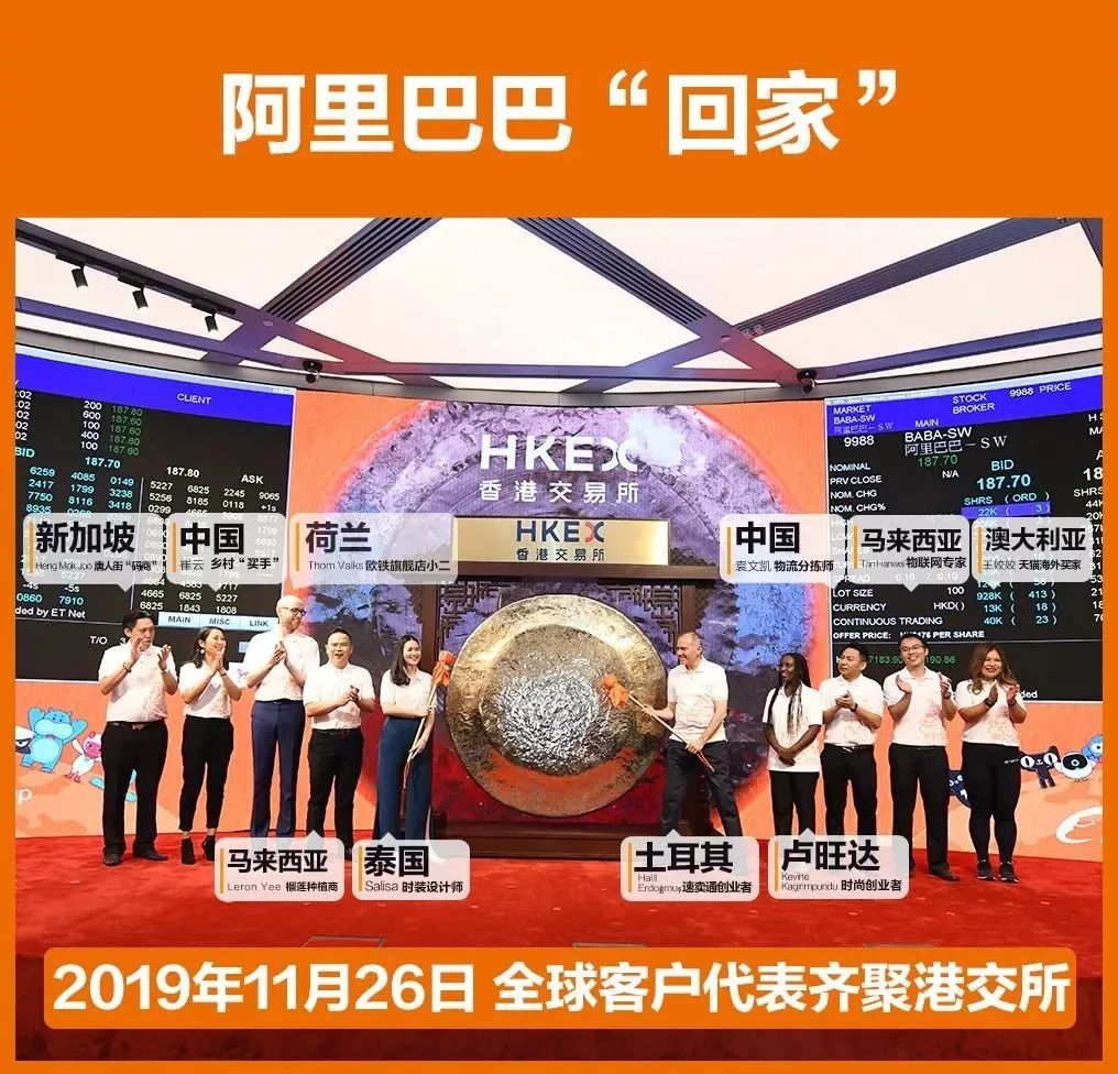 11月26日9點30分,阿里巴巴集團在中國香港交易所鳴鑼上市,開盤價187港元,較發行價大漲6.25%,阿里巴巴集團成為首個同時在美股和港股兩地上市的中國互聯網公司。